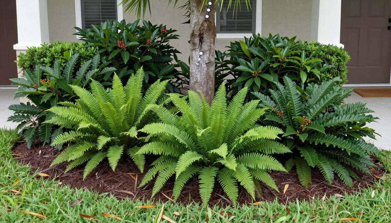 Coontie ( Zamia integrifolia ) mimics a fern at 2 to 3 feet. Full sun to shade suits it. Hosts Atala butterflies. Drought-proof once rooted.