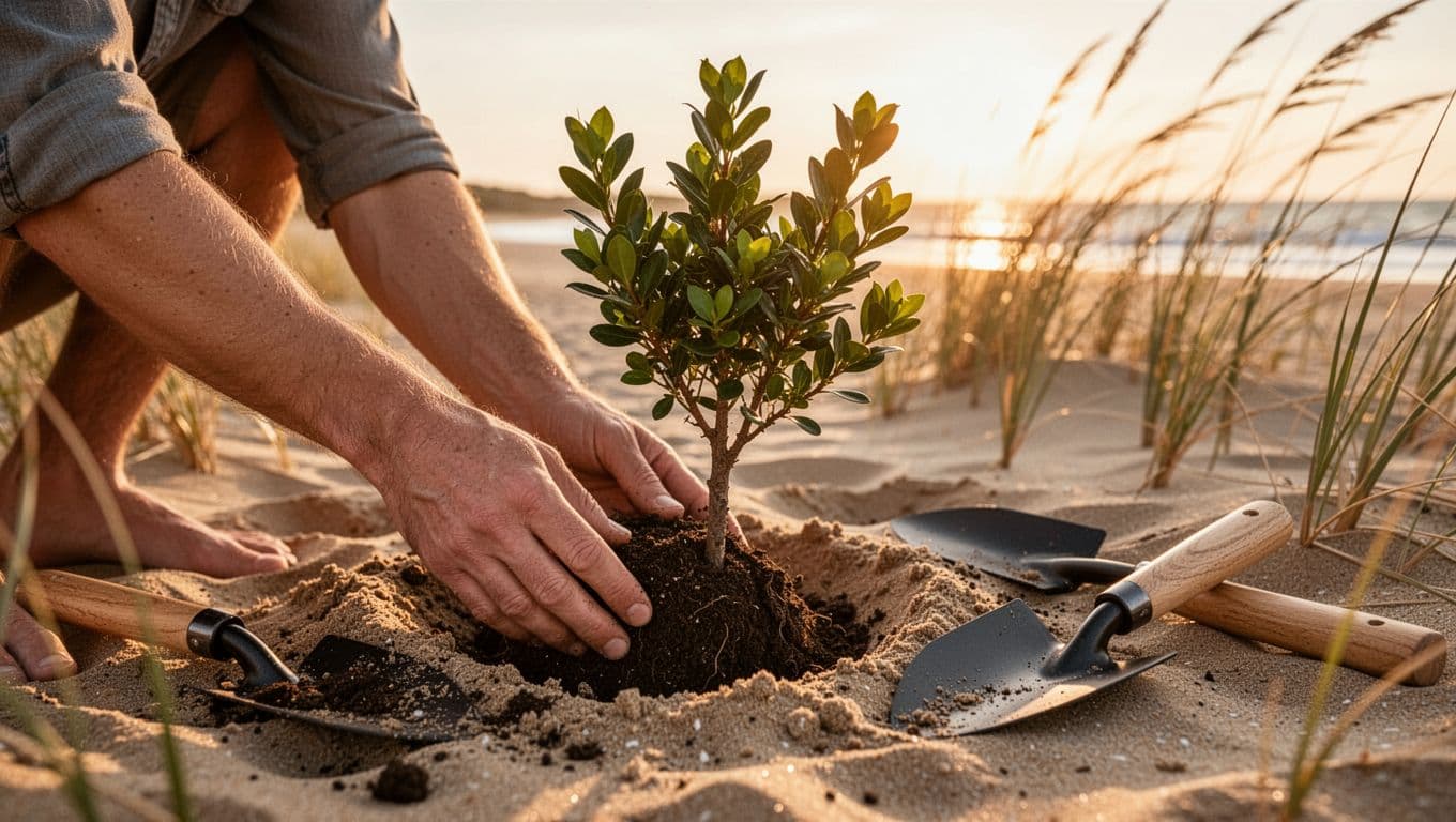 Plant in early spring or fall. Dig holes twice as wide as roots. Mix in compost if soil packs tight, but skip for pure sand.