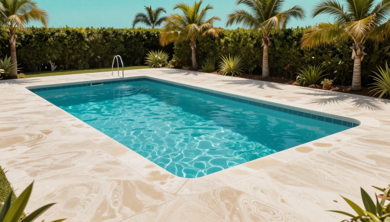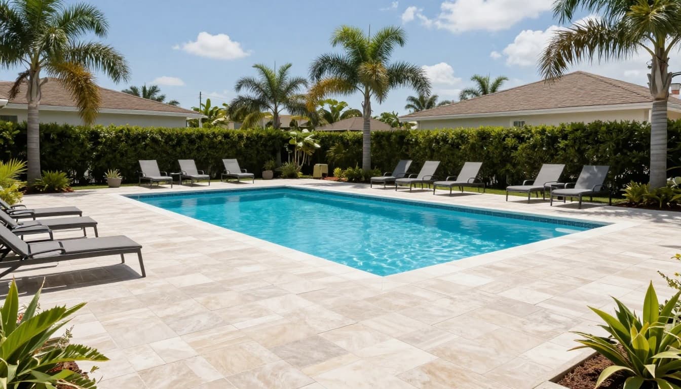 What materials handle Florida heat and rain best? Pavers and travertine beat concrete. They stay cool, drain fast.
