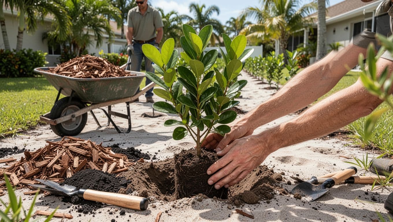 Cape Coral sits in a hurricane zone, so crews dig deeper holes and stake plants. That adds 10 to 20 percent to labor. Sandy soil needs organic matter mixed in; skip it, and roots dry out fast.