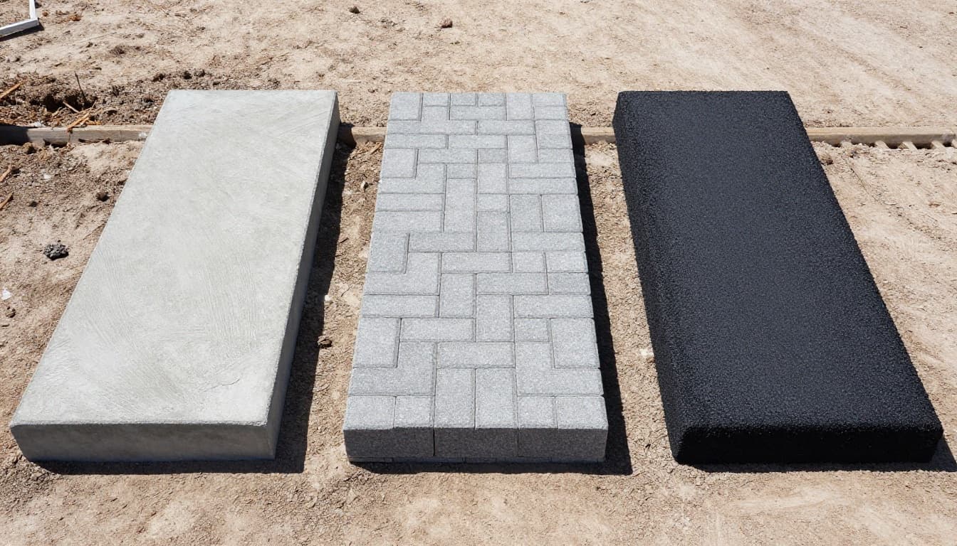 For concrete, pour 4-inch slabs with rebar. Broom finish grips tires. Pavers need sand bed over base; polymeric sand locks them. Asphalt rolls hot over tack coat.