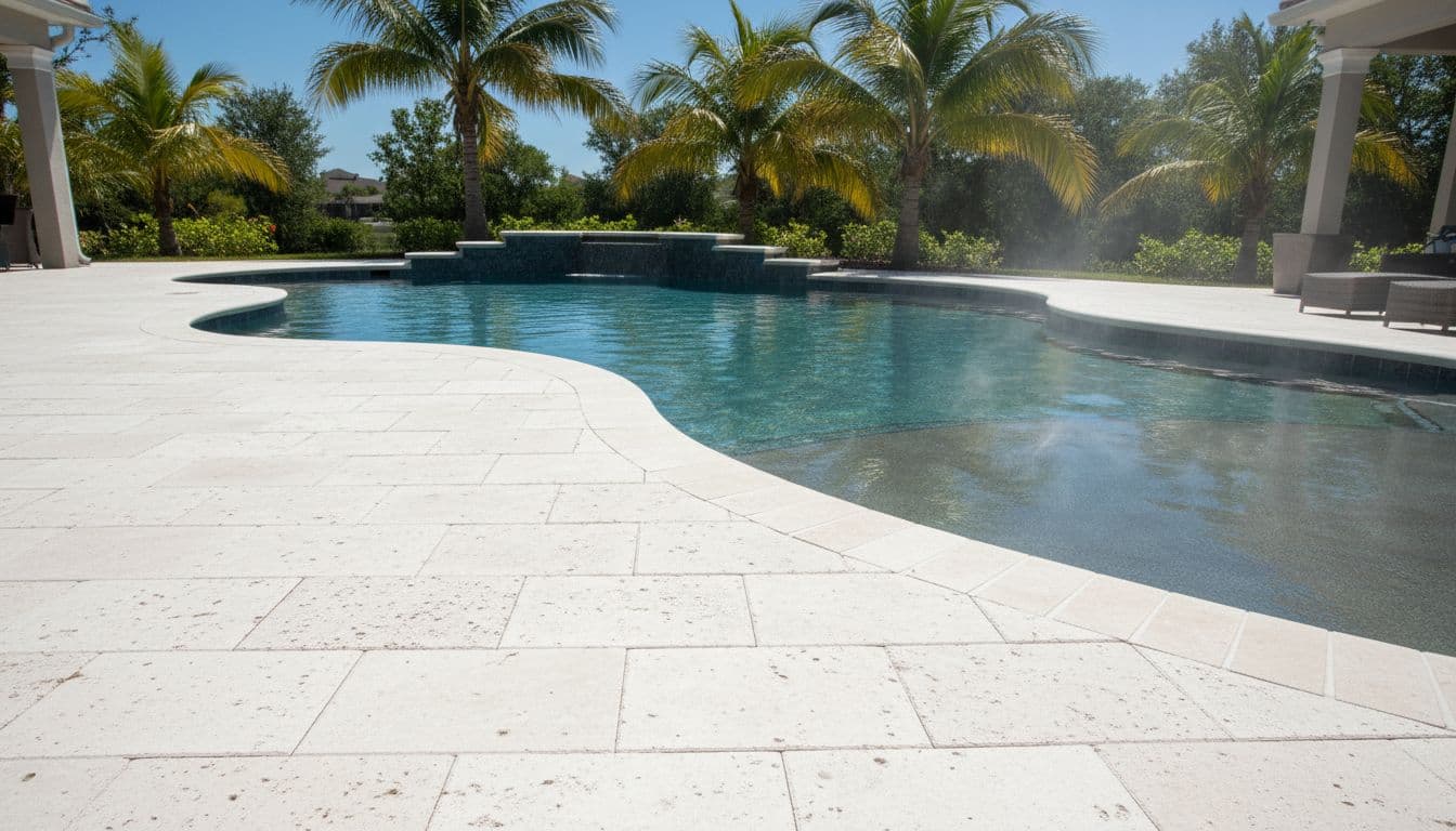 Travertine stays popular for pool decks because it can feel cooler and looks upscale, but it can cost more and needs the right sealer. Standard concrete pavers offer the most color and pattern options, plus easier repairs, yet darker colors can run hot. Stamped concrete can cost less upfront on some layouts, although cracking and repairs are harder to hide.
